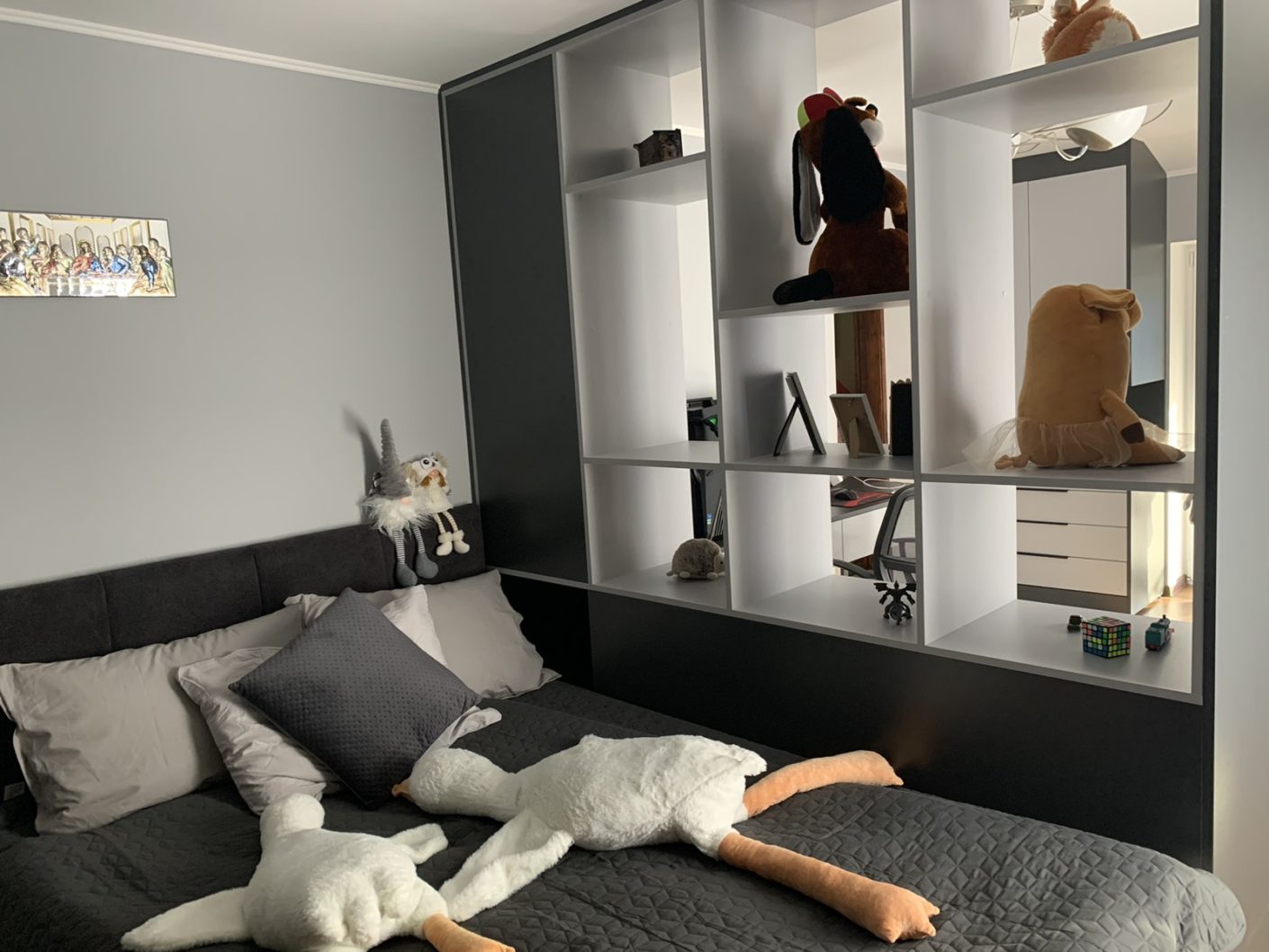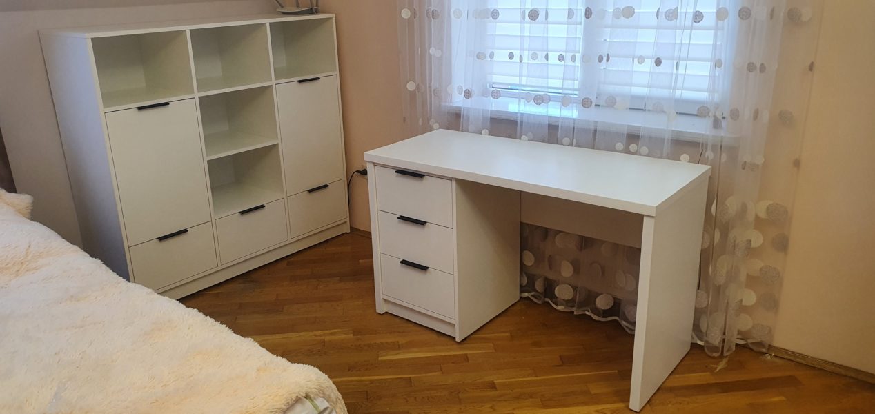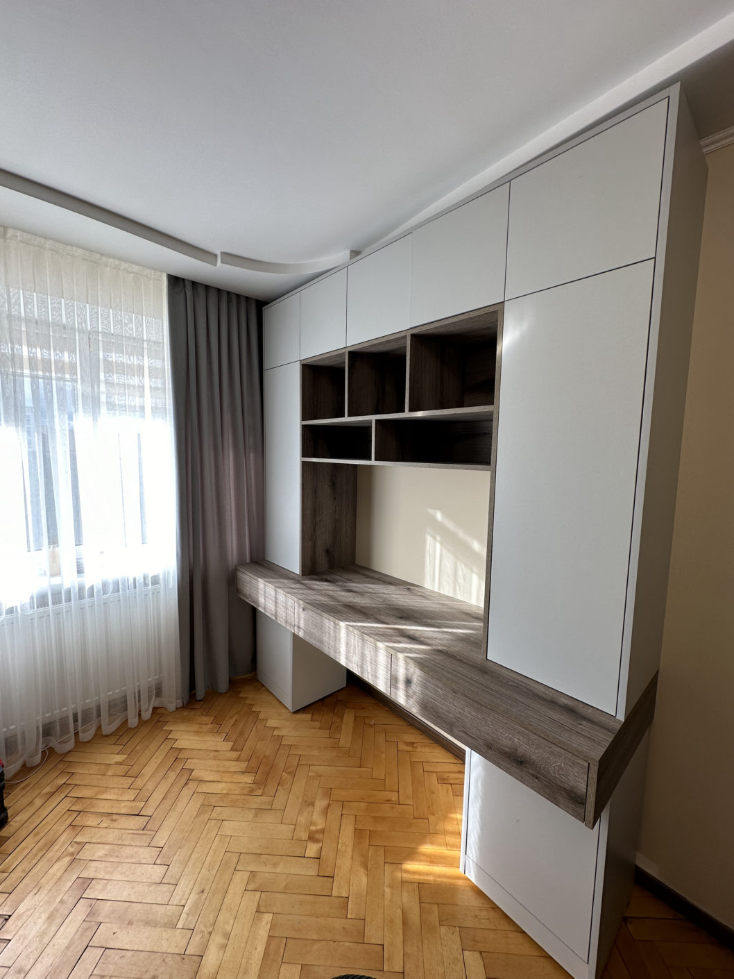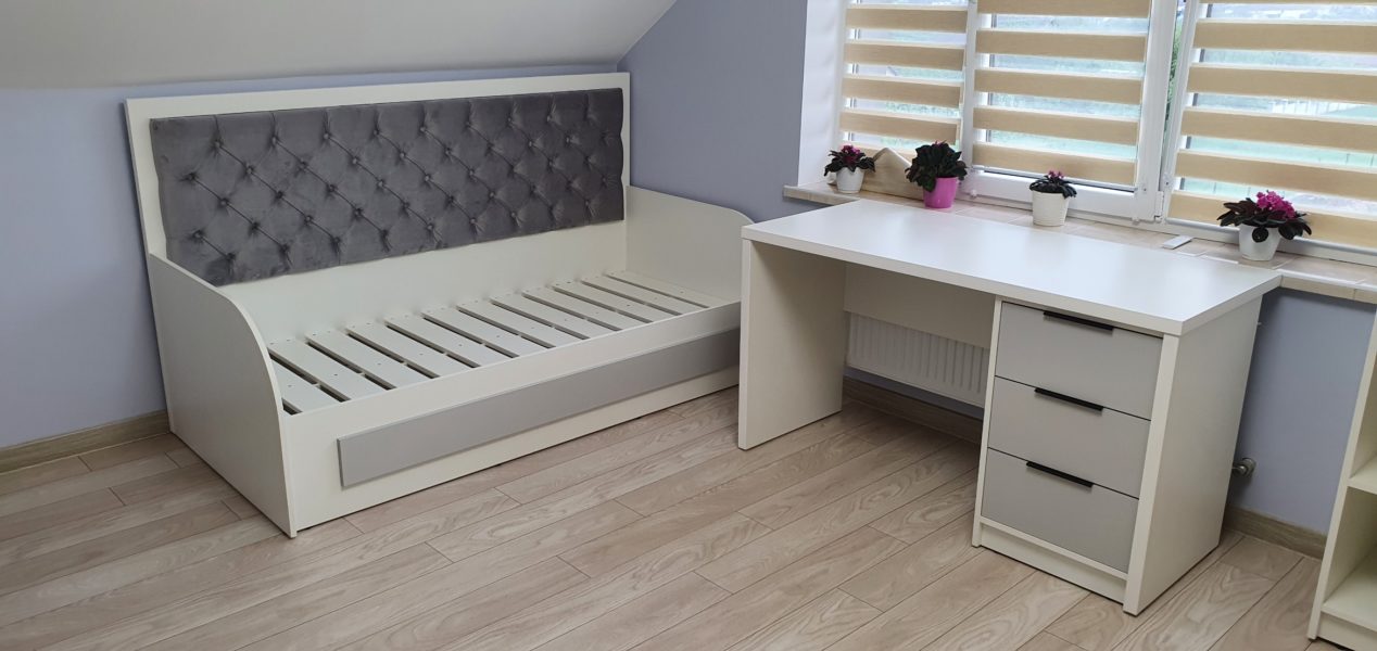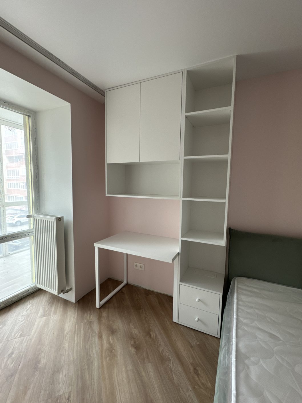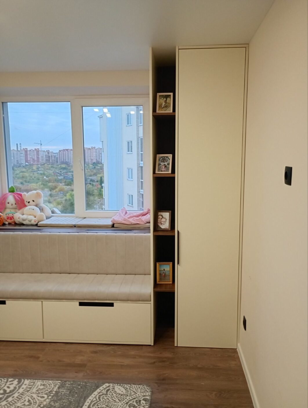 На фото наших робіт можна побачити приклади: шафи з вбудованими полицями, ліжка з м’яким узголів’ям, двоярусні комплекти для двох дітей, а також стильні письмові столи зі зручними системами зберігання.
