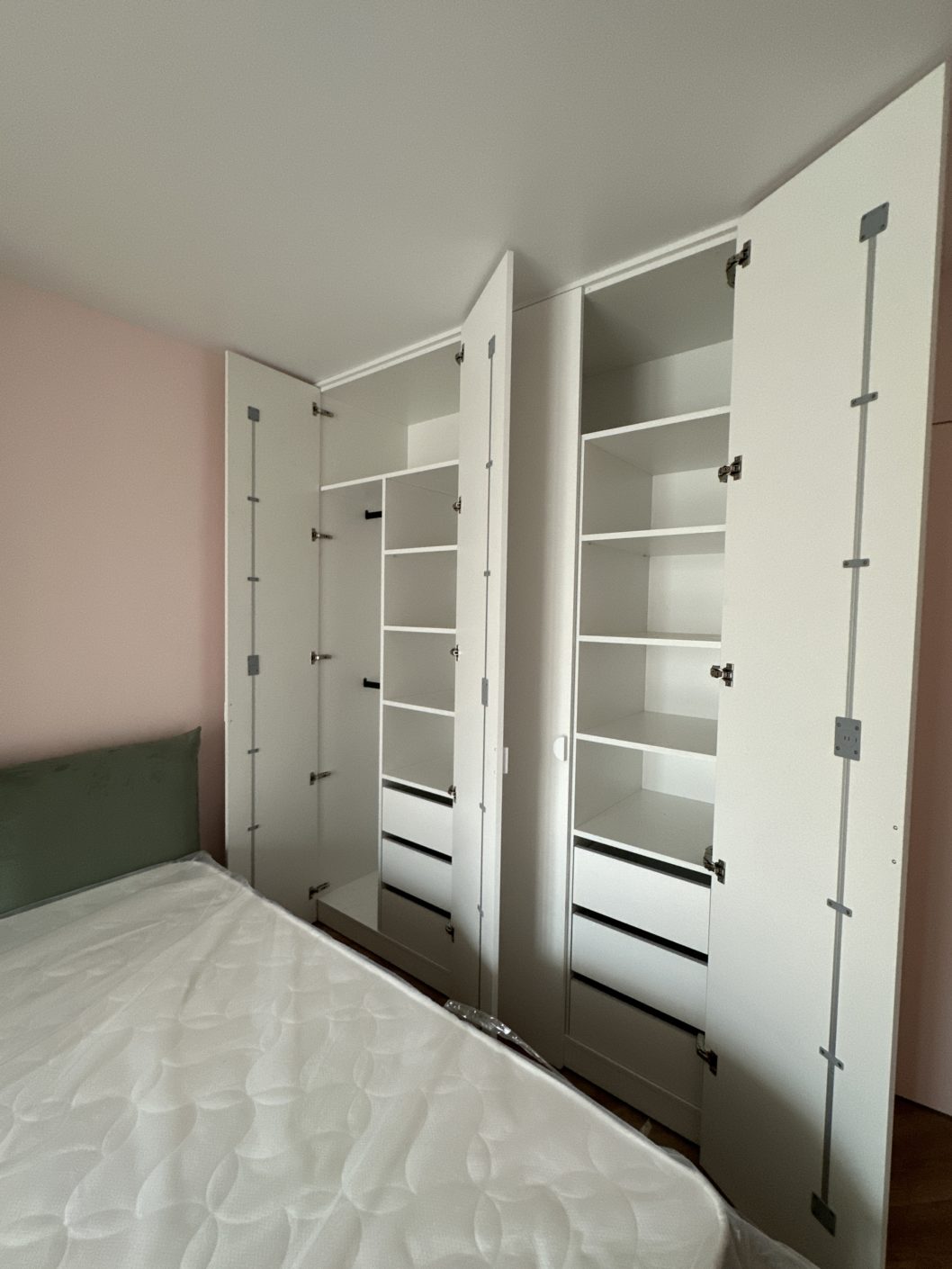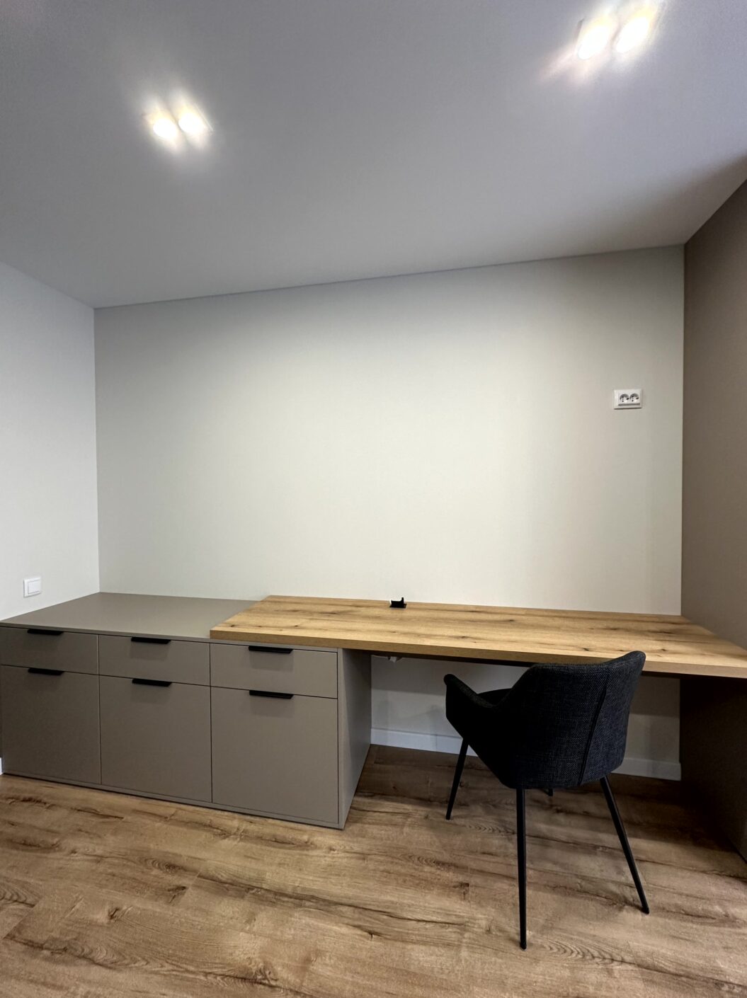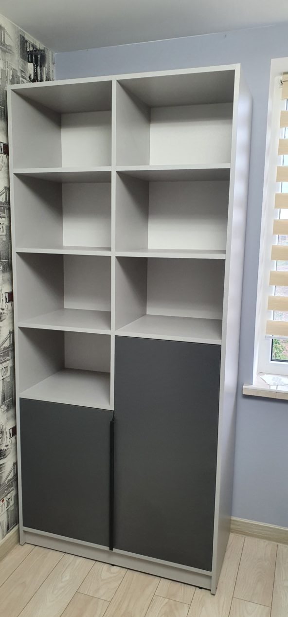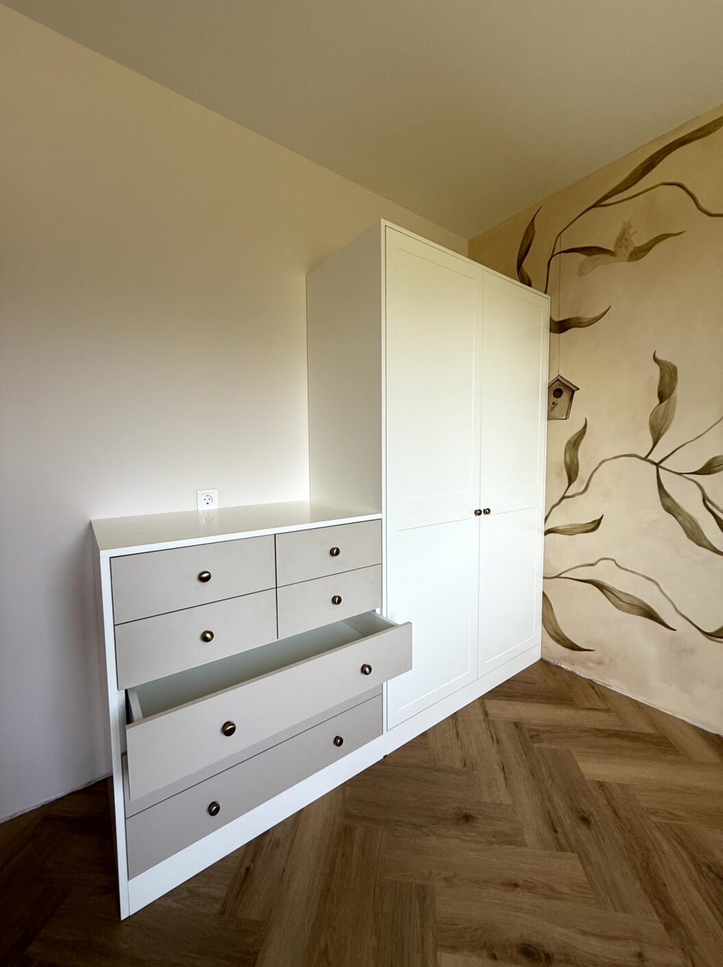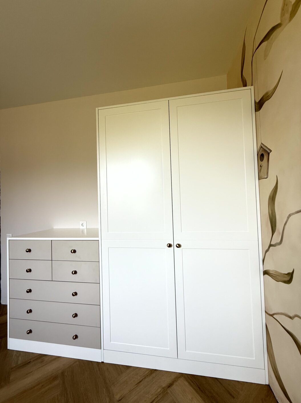 На фото наших робіт можна побачити приклади: шафи з вбудованими полицями, ліжка з м’яким узголів’ям, двоярусні комплекти для двох дітей, а також стильні письмові столи зі зручними системами зберігання.
