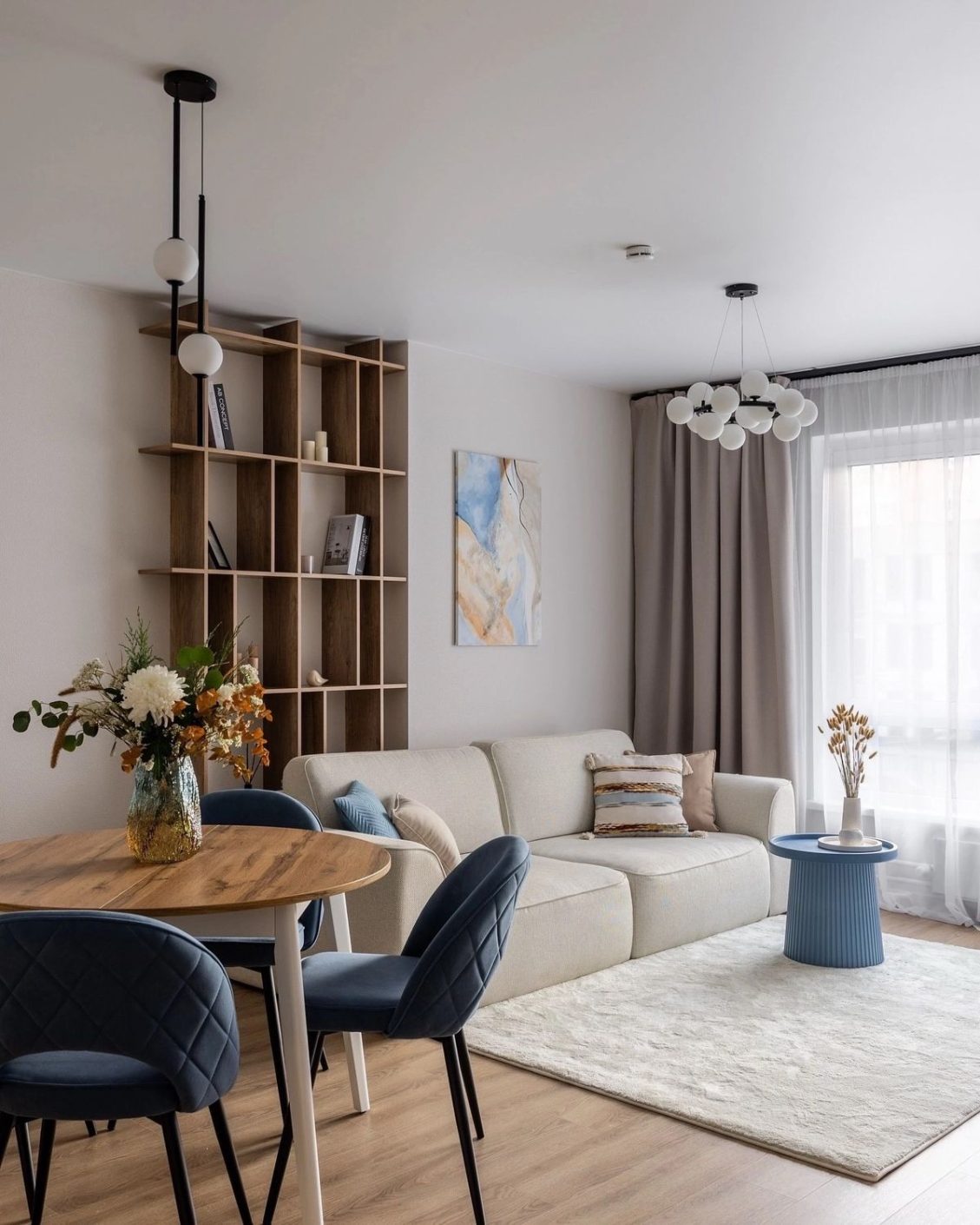 Синій колір додає глибини, а білий підкреслює чистоту інтер’єру. Такий дует часто використовують у скандинавських та середземноморських стилях.