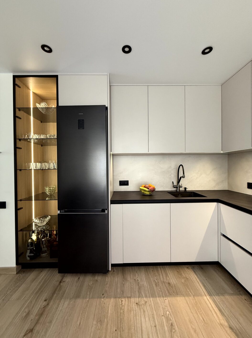 У меблевих проектах на замовлення ми часто поєднуємо відкриті полиці та закриті фасади — це допомагає створити баланс між практичністю та стилем. Крім того, шафи у висоту візуально збільшують приміщення, роблячи стелю «вищою».