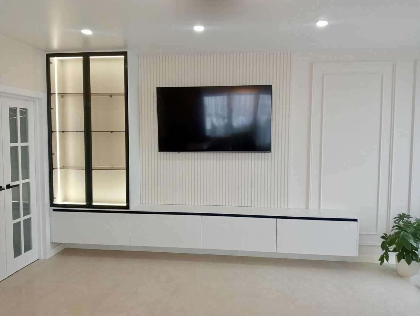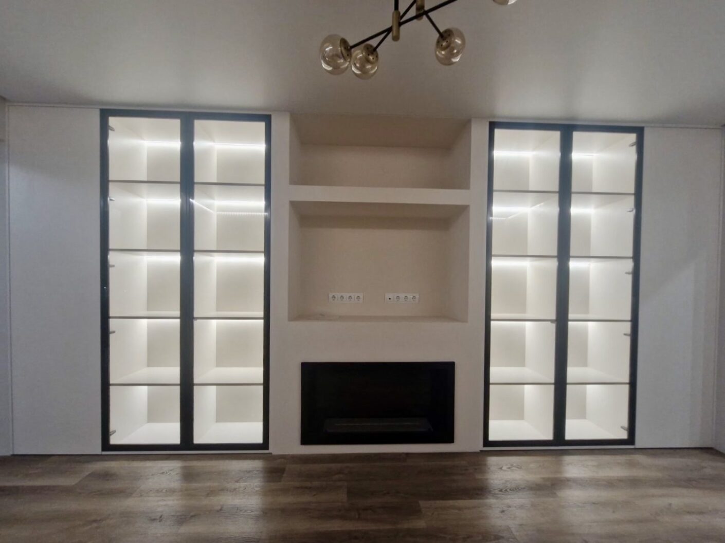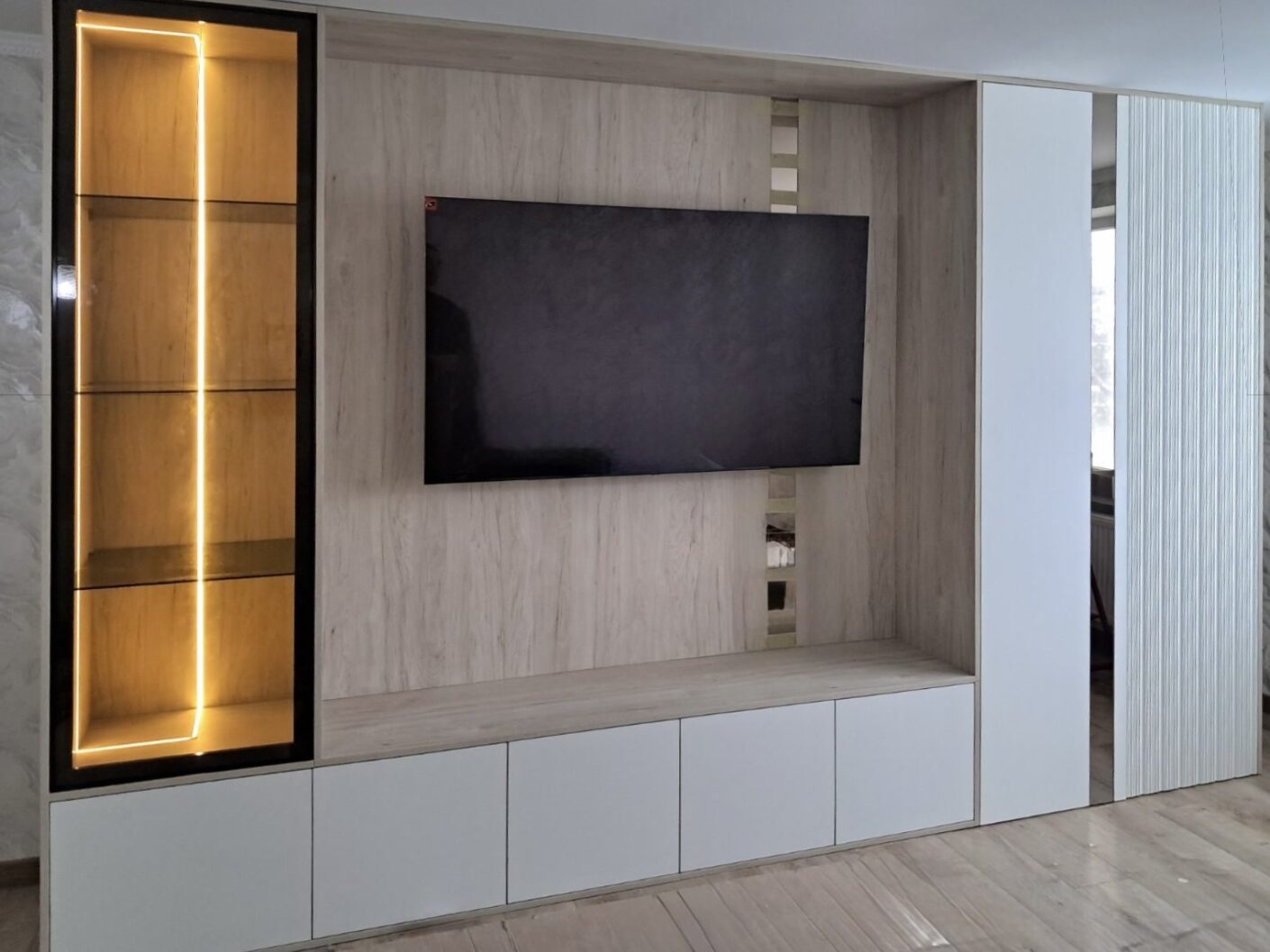 На фото наших робіт ви бачите різні варіанти: від світлих мінімалістичних конструкцій із вбудованим склом до стильних комбінацій дерева й металу. Кожна така стінка чи шафа виглядає сучасно та додає інтер’єру гармонії.